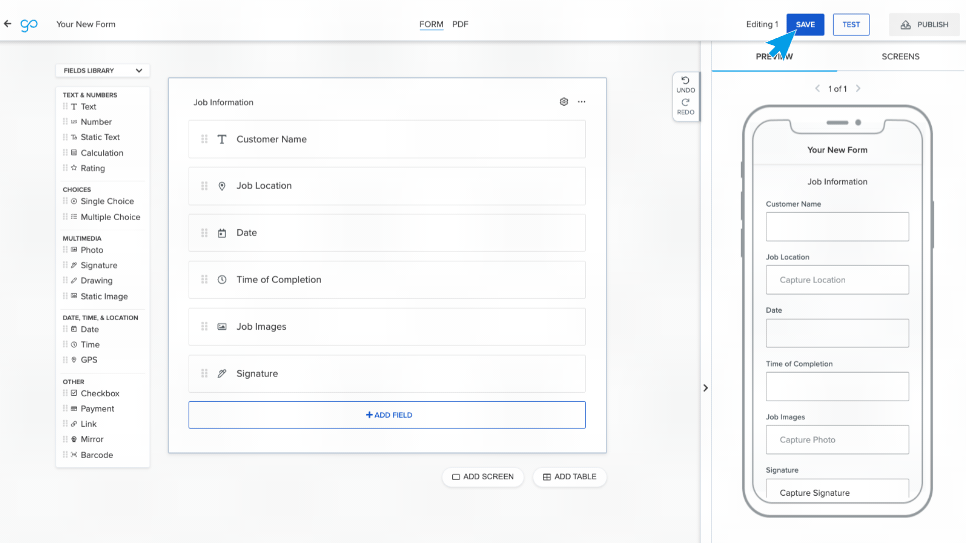 - Save your form: In the GoCanvas Form Builder, ensure your form is complete and hit “Save” to secure your changes.